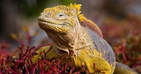The Galapagos land iguana has a primarily herbivorous diet. They mainly eat leaves, fruits, and flowers such as prickly pear cactus, shrubs and guava tree leaves. They are also known to occasionally eat insects, centipedes and carrion, but these make up only a small portion of their diet.