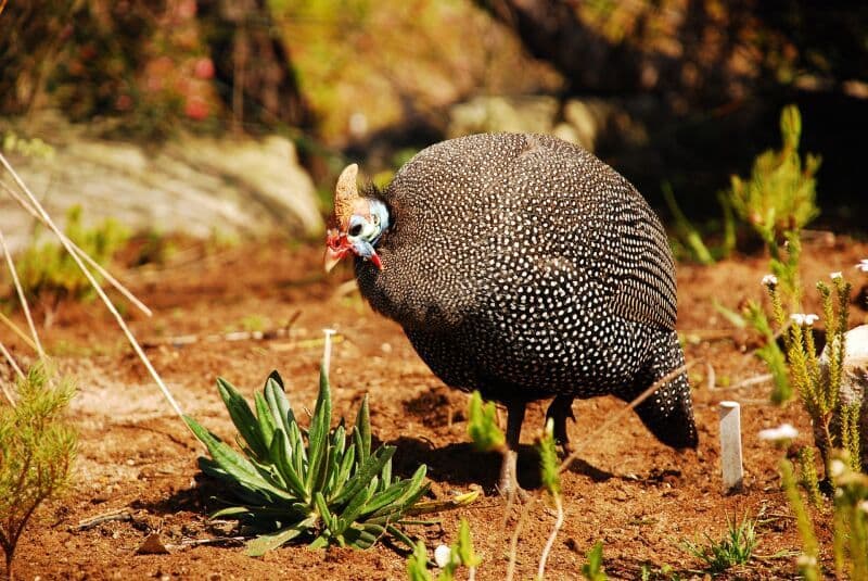 Helmeted guineafowl are omnivorous birds that spend most of their time searching for food. They mainly consume seeds, grasses, insects and small vertebrates.