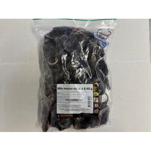 Frozen dark mice of a mixture of sizes in a 1kg bag. Ideal to feed to rehabilitating animals and birds.
